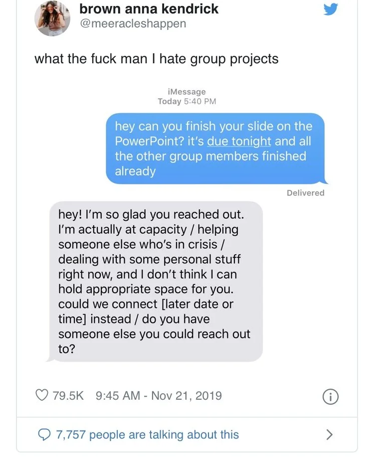 Of course, this quickly became a meme, it has a strong and translatable template that is begging to be made into a meme. Variations on this meme, highlight I think the positioning of emotional engagement with a friend as difficult or draining labour.