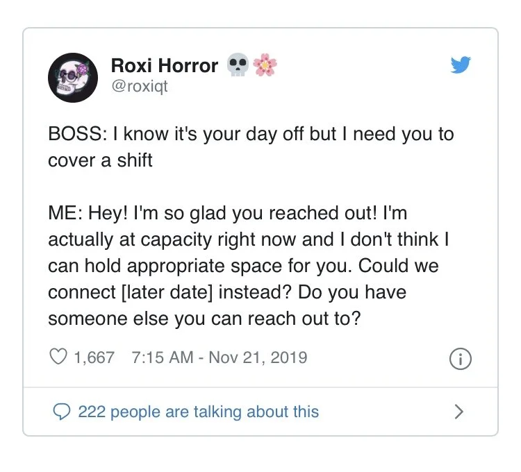 The thread concludes with a template of how to handle these mediated requests for support, which are again framed as emotional labour.